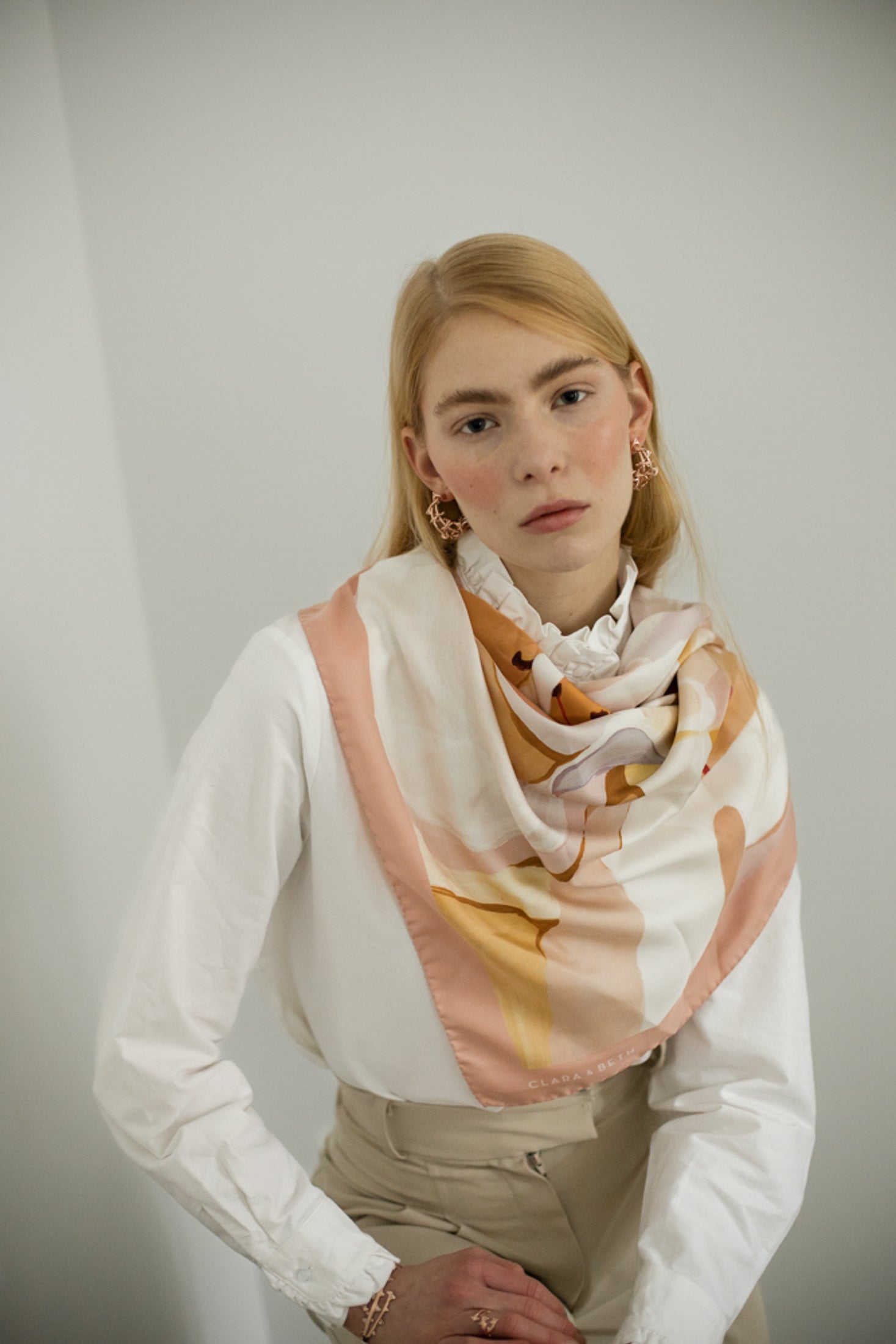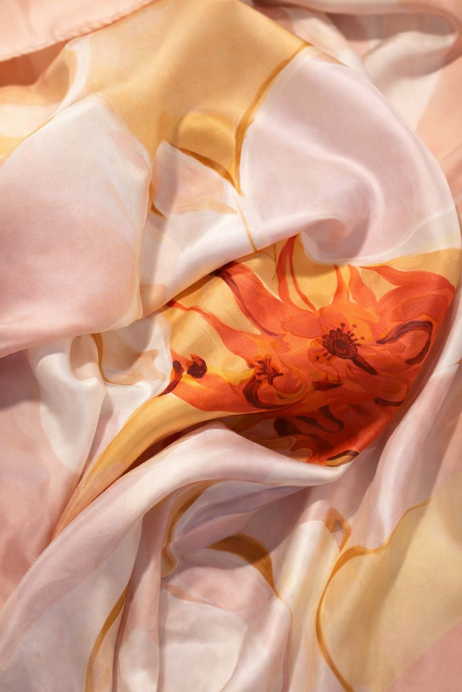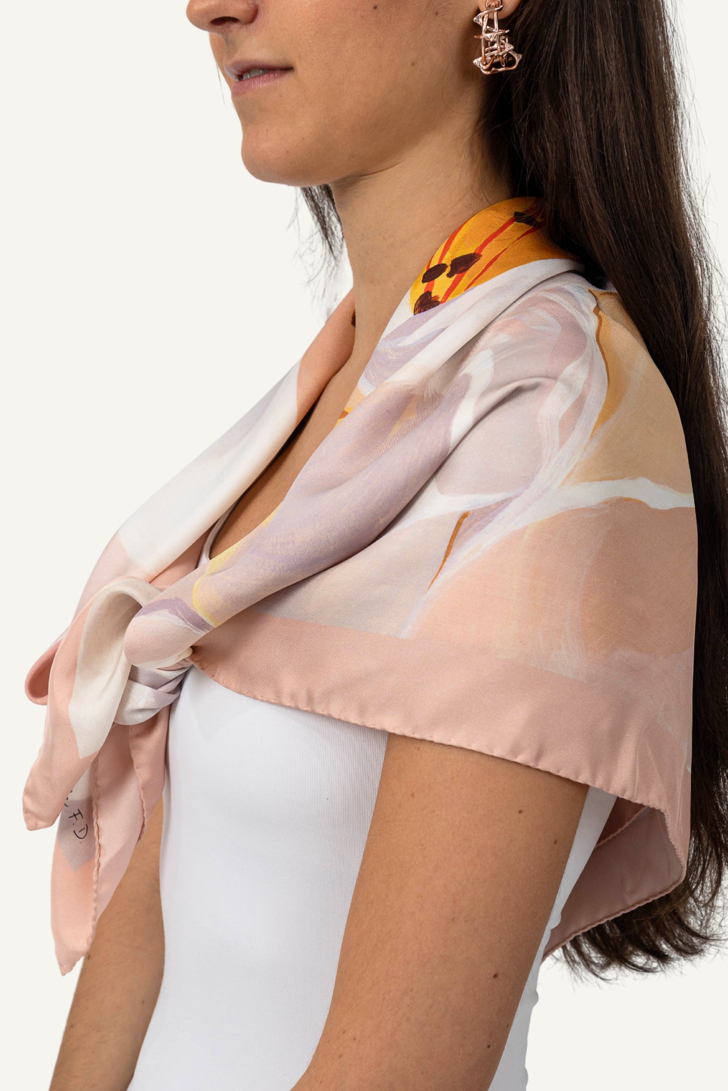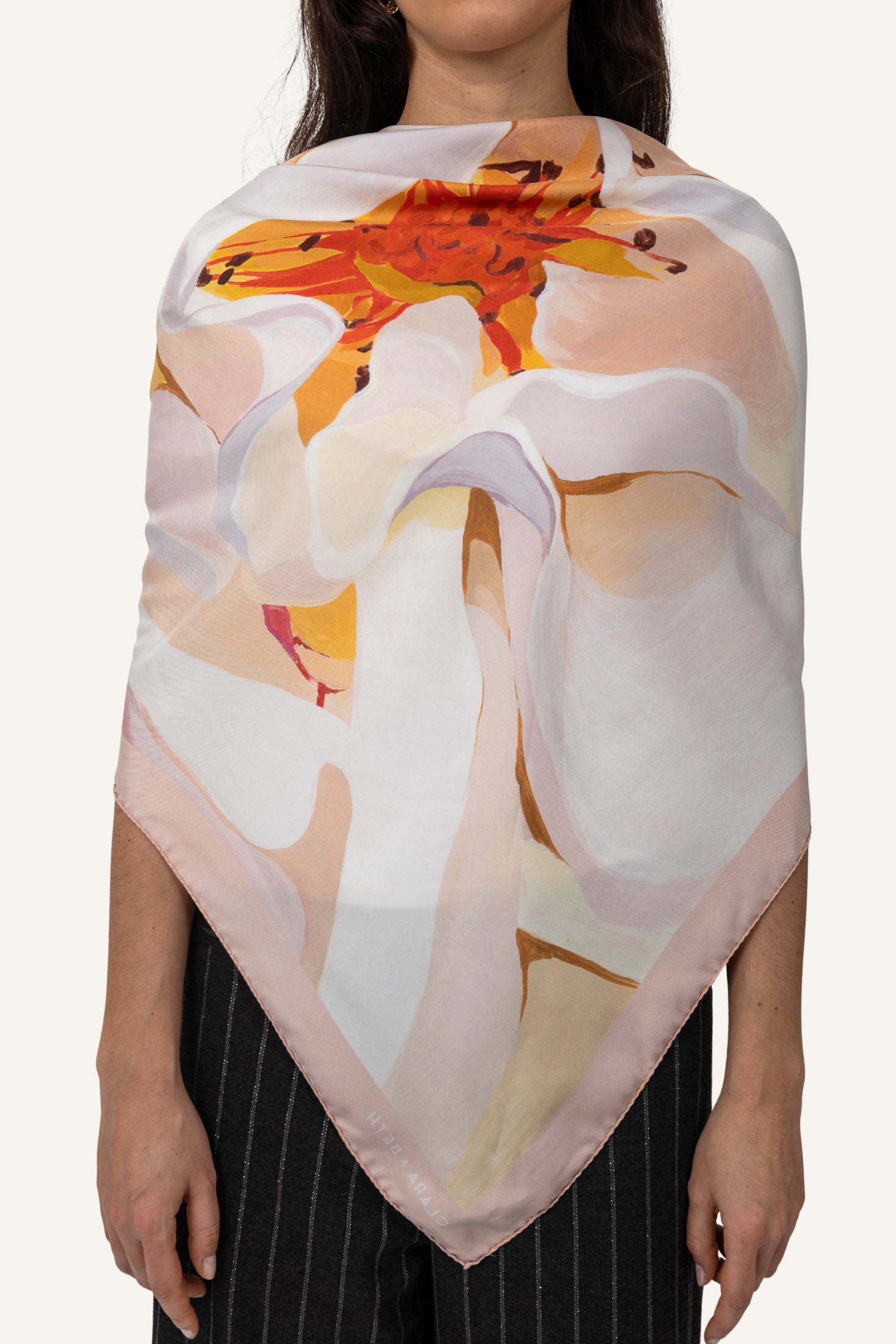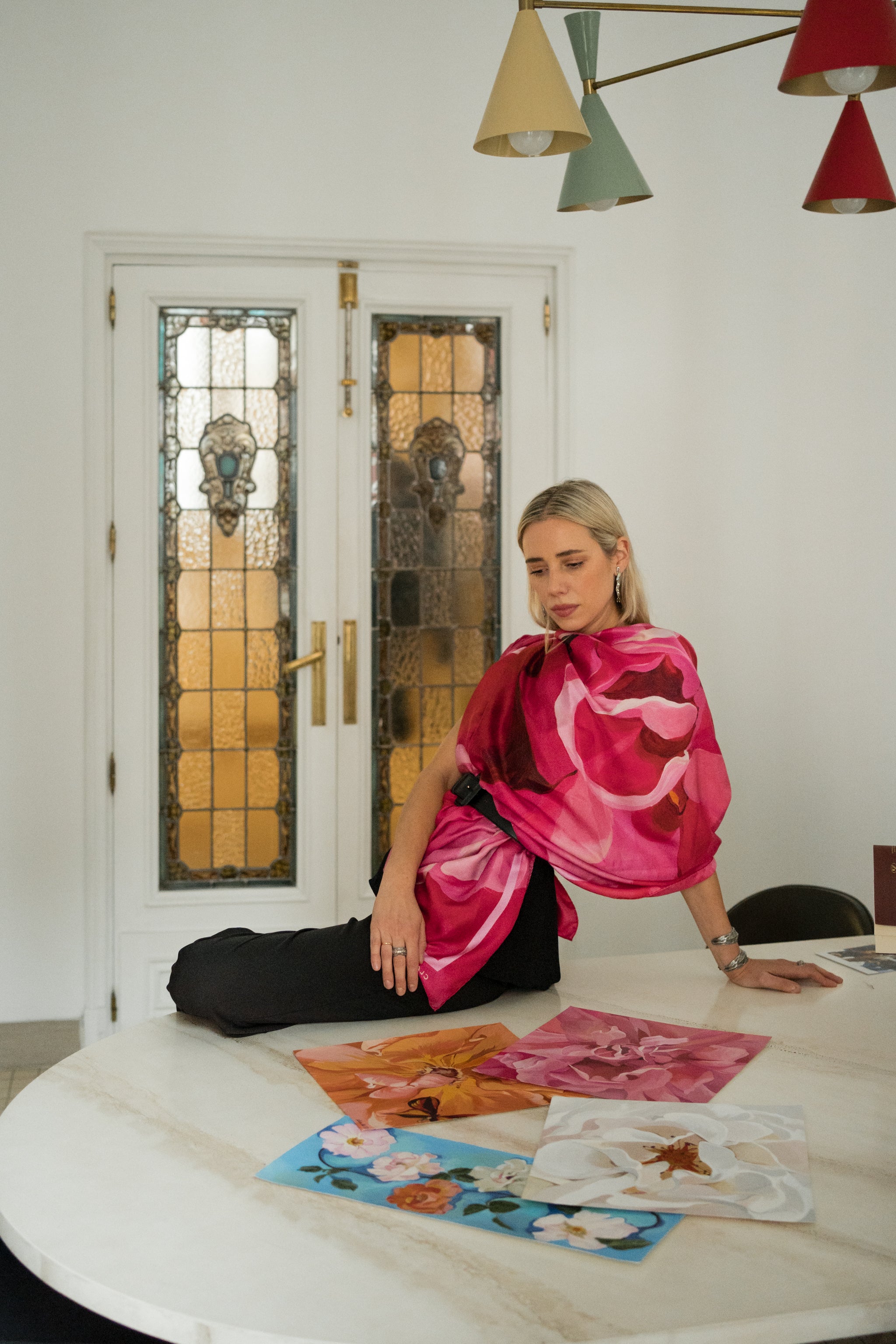 Esta colección de pañuelos nace de la colaboración con la artista Lulu Figueroa y de su mirada a la naturaleza y a la belleza de lo cotidiano. A partir de sus pinturas, donde las flores y la rosa como protagonista aparecen en distintos momentos de floración, trasladamos su universo pictórico a la seda, respetando el color, el trazo y la emoción original de la obra.