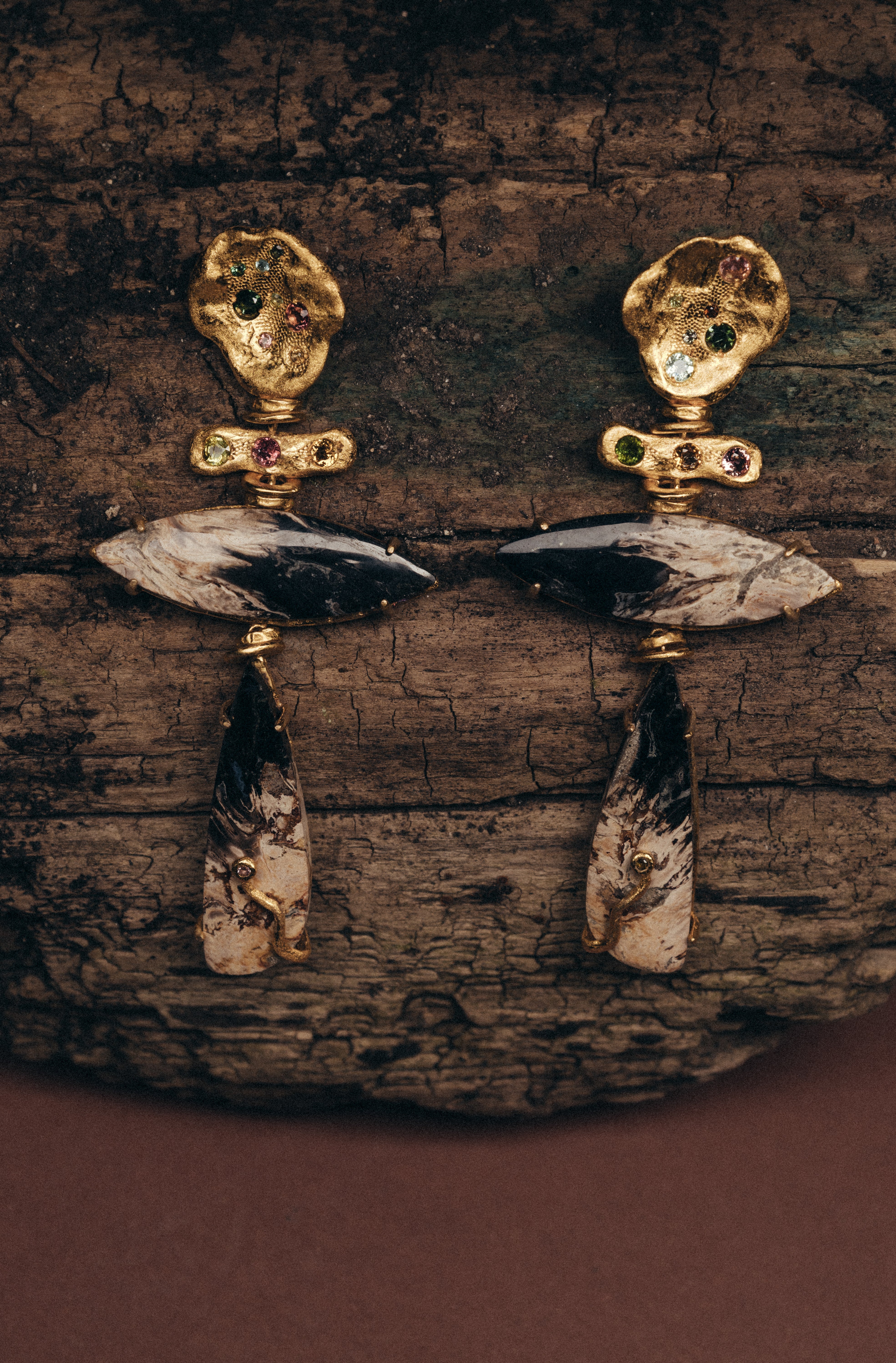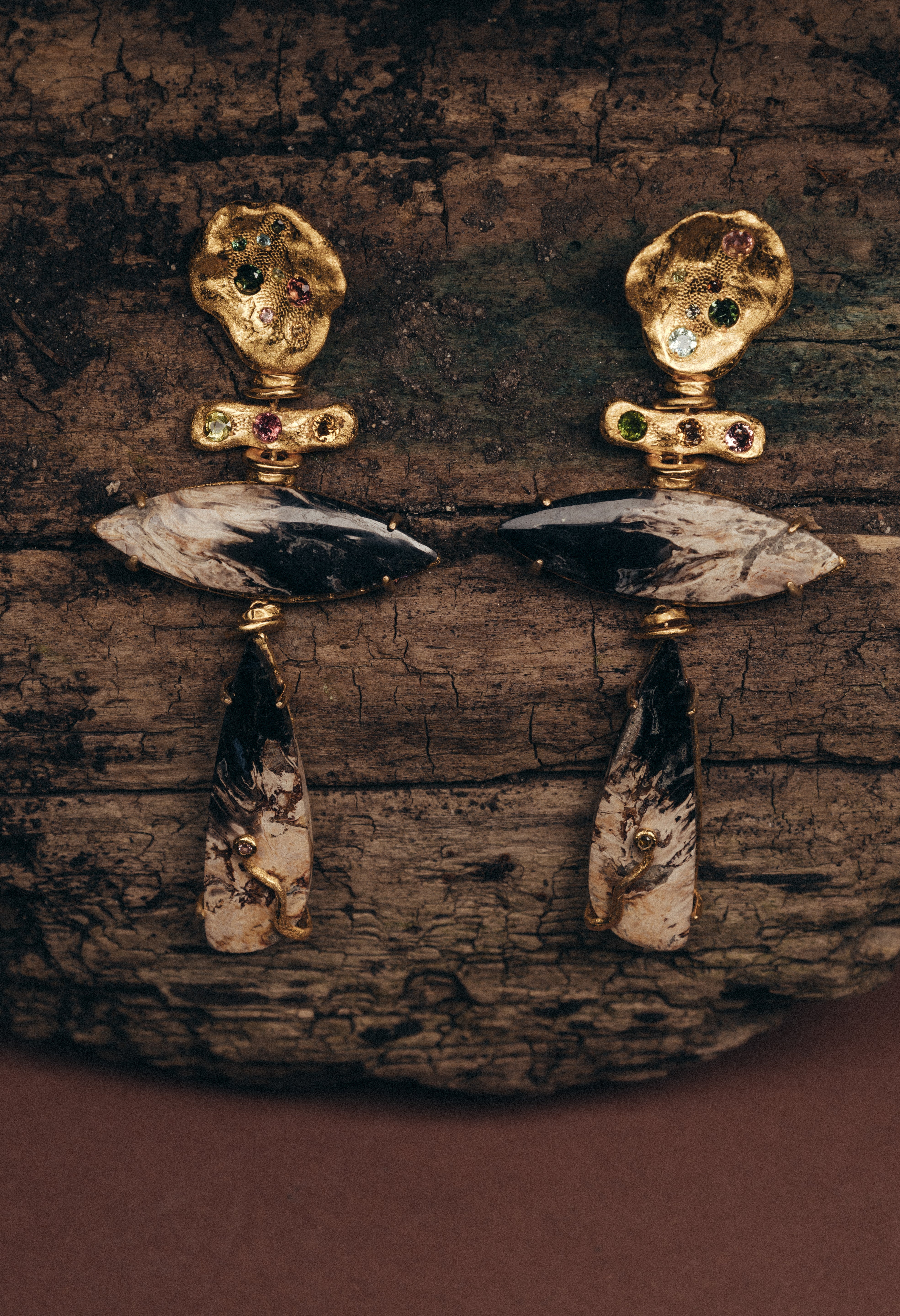 Su textura, cuidadosamente rayada a mano, les otorga un carácter orgánico y distintivo, mientras que las turmalinas naturales de colores variados aportan un toque de elegancia y vibrante sofisticación. La pieza central de los pendientes es la imponente madera fosilizada, que conecta con el pasado remoto de la Tierra, encapsulando millones de años de historia en un diseño moderno y atemporal.