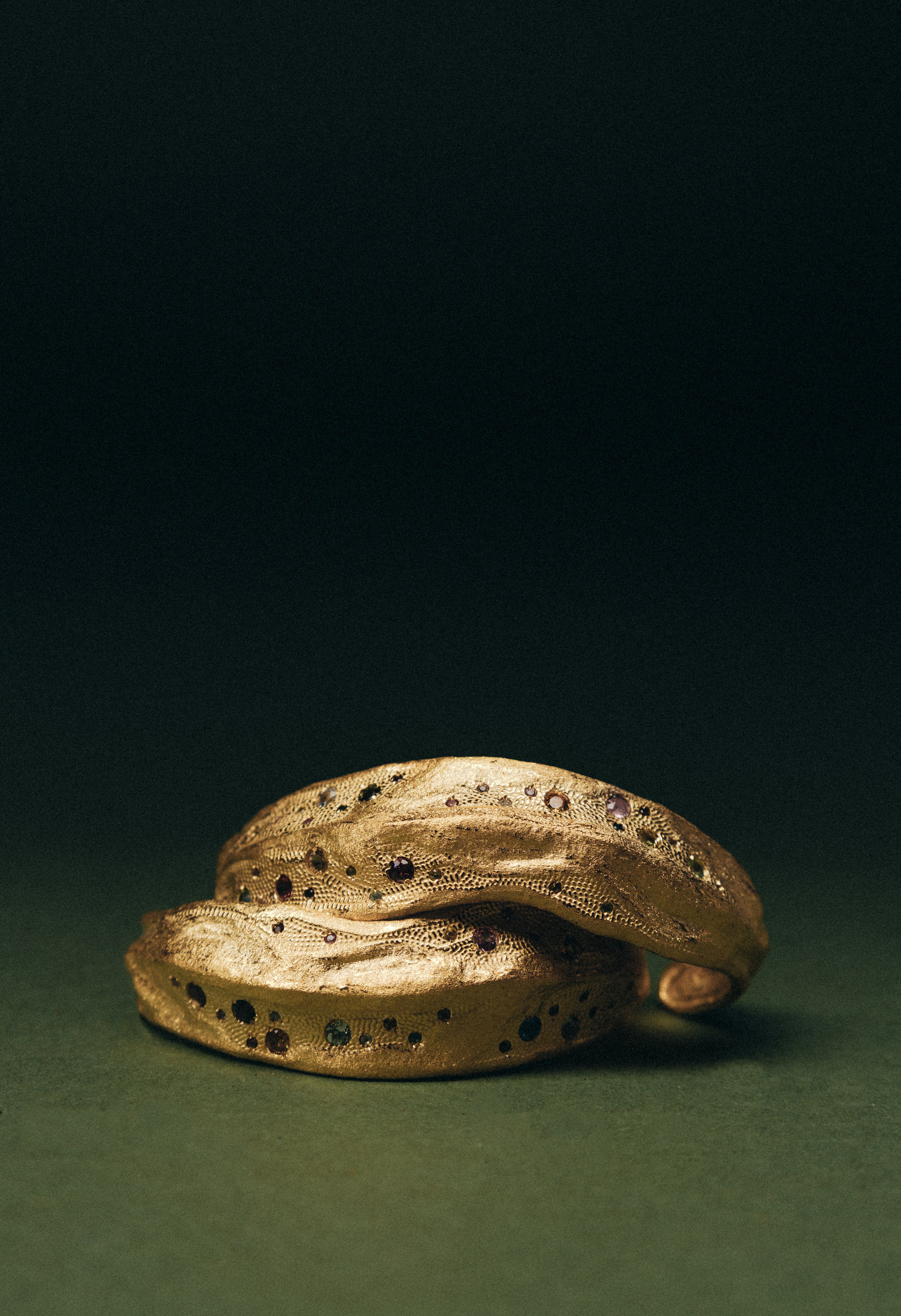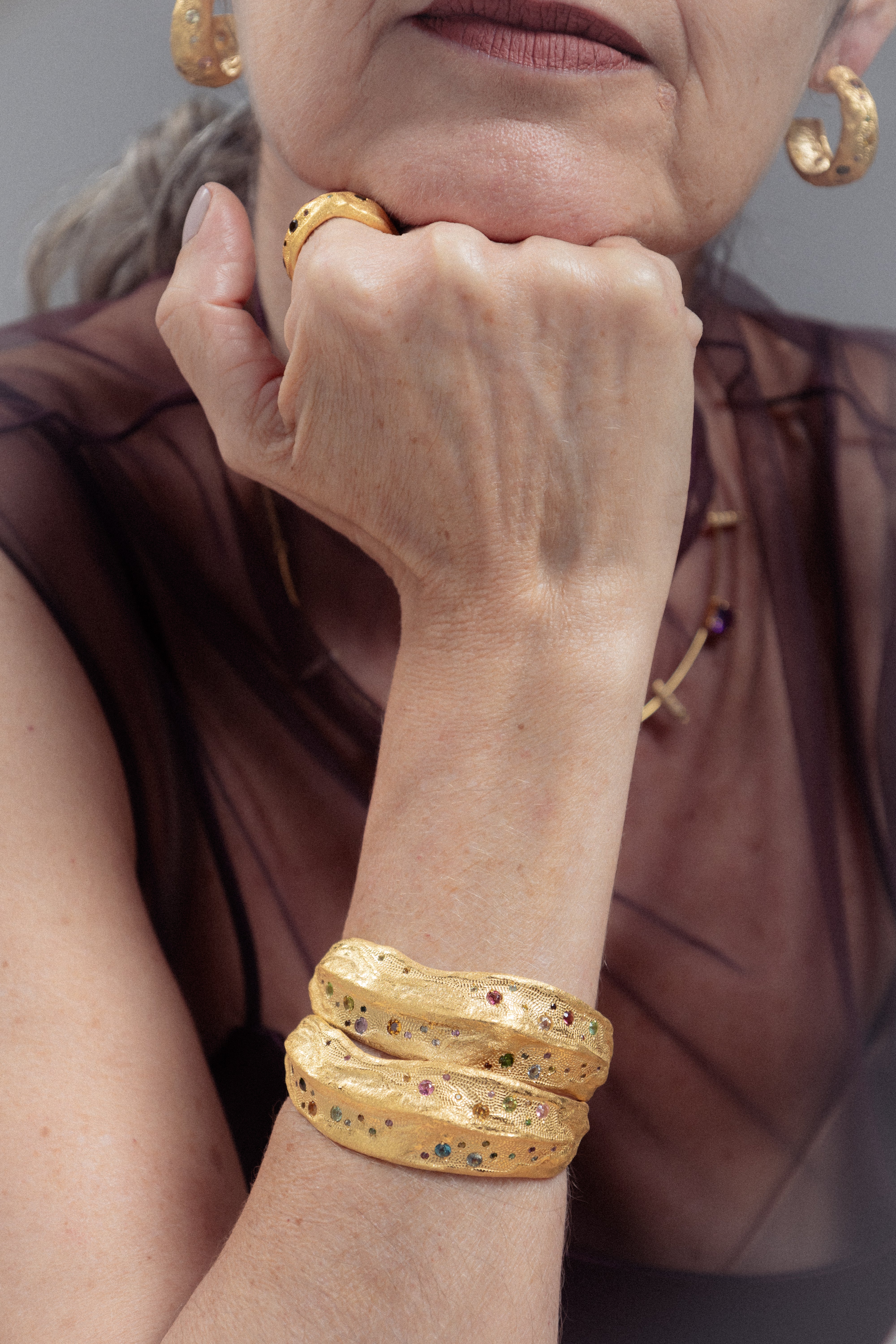 Sus formas orgánicas evocan dunas que se desplazan suavemente con el viento, transportándote a paisajes lejanos y exóticos. Cada turmalina, única en su color y forma, refleja la diversidad y riqueza de los caminos no recorridos. El diseño artesanal y cuidado meticuloso en cada detalle hacen de este brazalete una declaración de estilo y autenticidad.