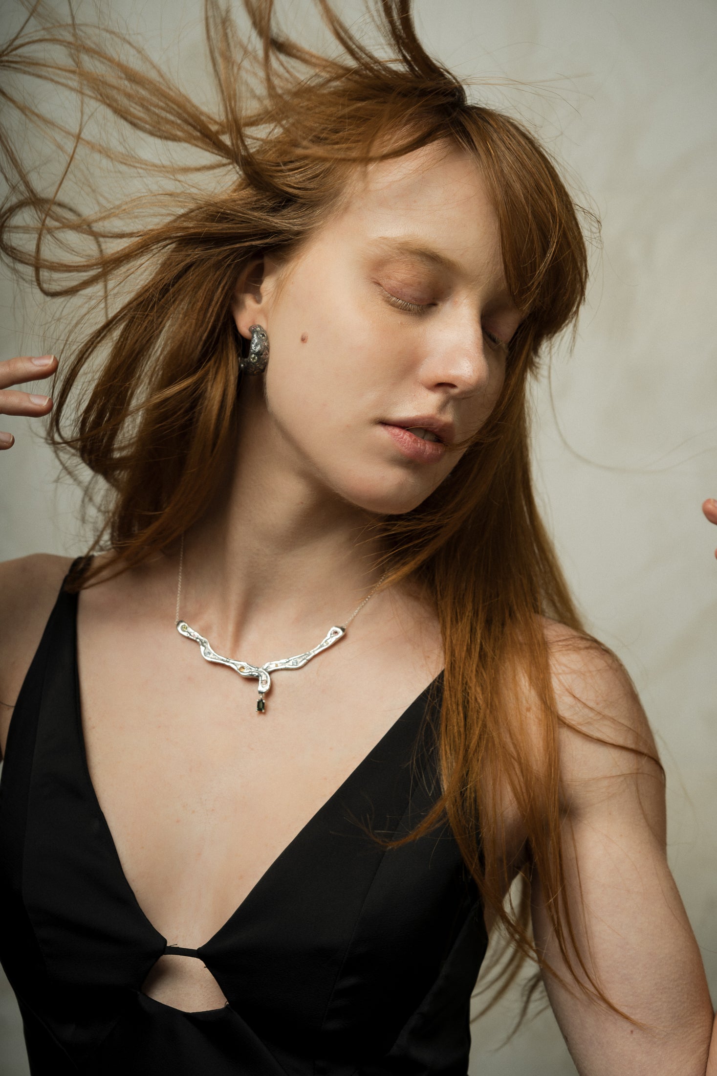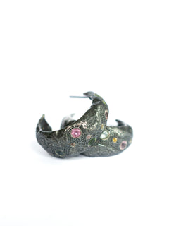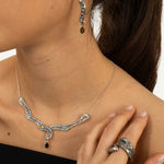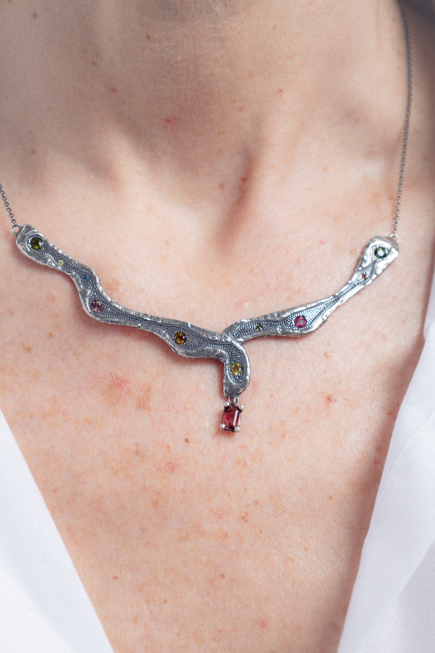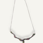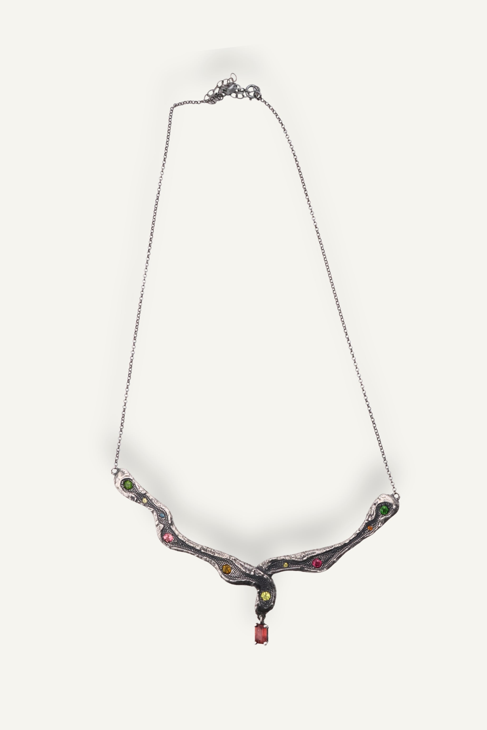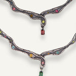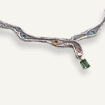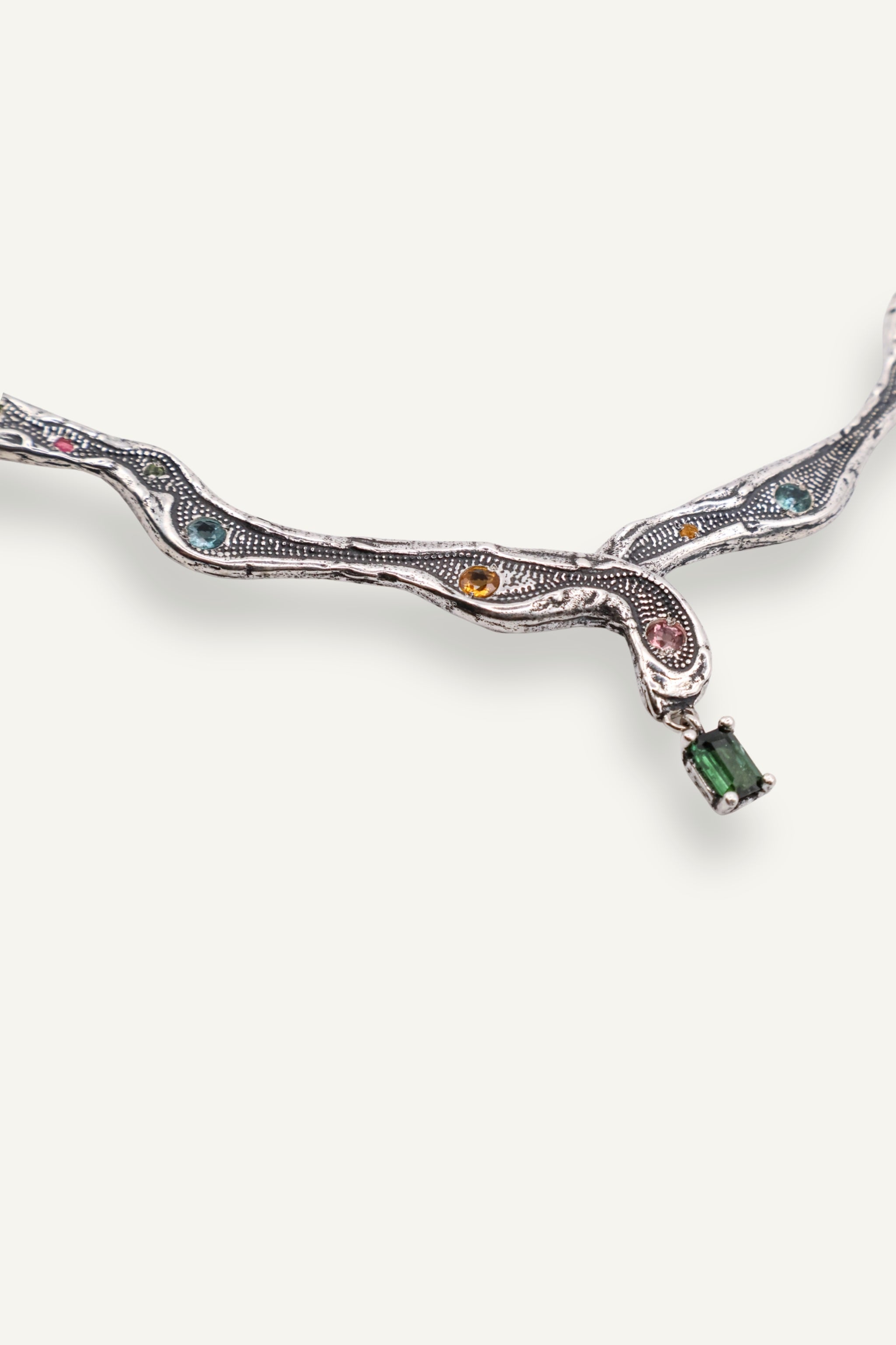 Su diseño serpenteante e irregular recorre el cuello de forma fluida, como si hubiese sido modelado por el tiempo y la naturaleza. A lo largo de la pieza, turmalinas naturales salteadas y aleatorias aportan destellos de color y energía, haciendo que cada collar sea único. En el centro, una turmalina rectangular actúa como punto de equilibrio y fuerza.